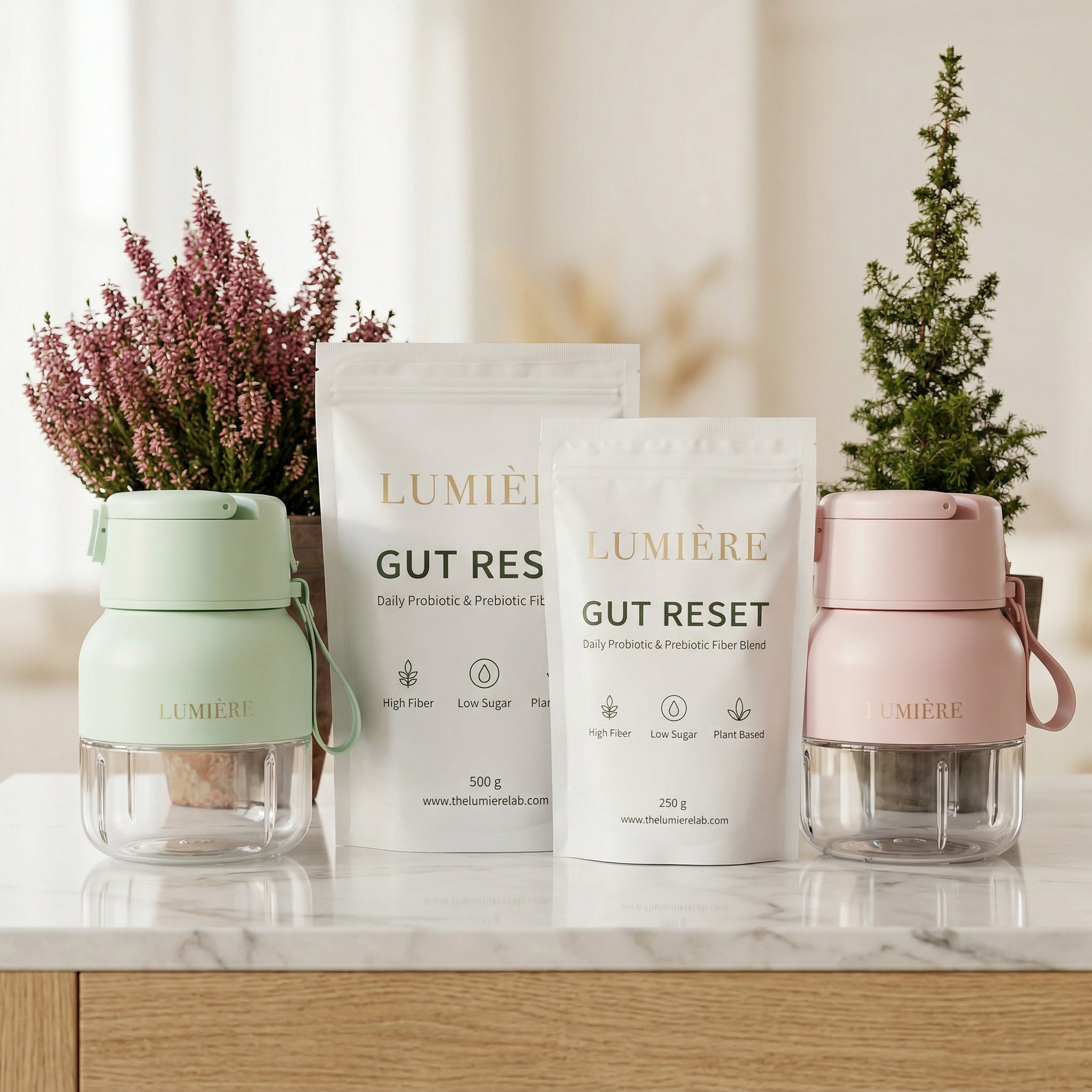 Everything you need to begin your Lumière journey. Our Starter Kit combines the science-backed Gut Reset supplement with a premium portable blender designed for the modern wellness ritual.